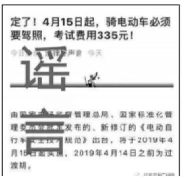 网传4月15日起骑电动自行车要考驾照,考试费用335元,交管部门辟谣。网络截图