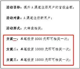 如下图,以笔者亲历的某互金平台抽奖活动来看,大家选择方案二的逻辑,在于我们从该渠道历史数据得知,用户首次平均投资额为8000元,设置10000元门槛对用户而言是一个可以触达的任务,用户补充约20%的资金可参与抽奖。通常在超值奖品的诱惑下用户会愿意尝试。